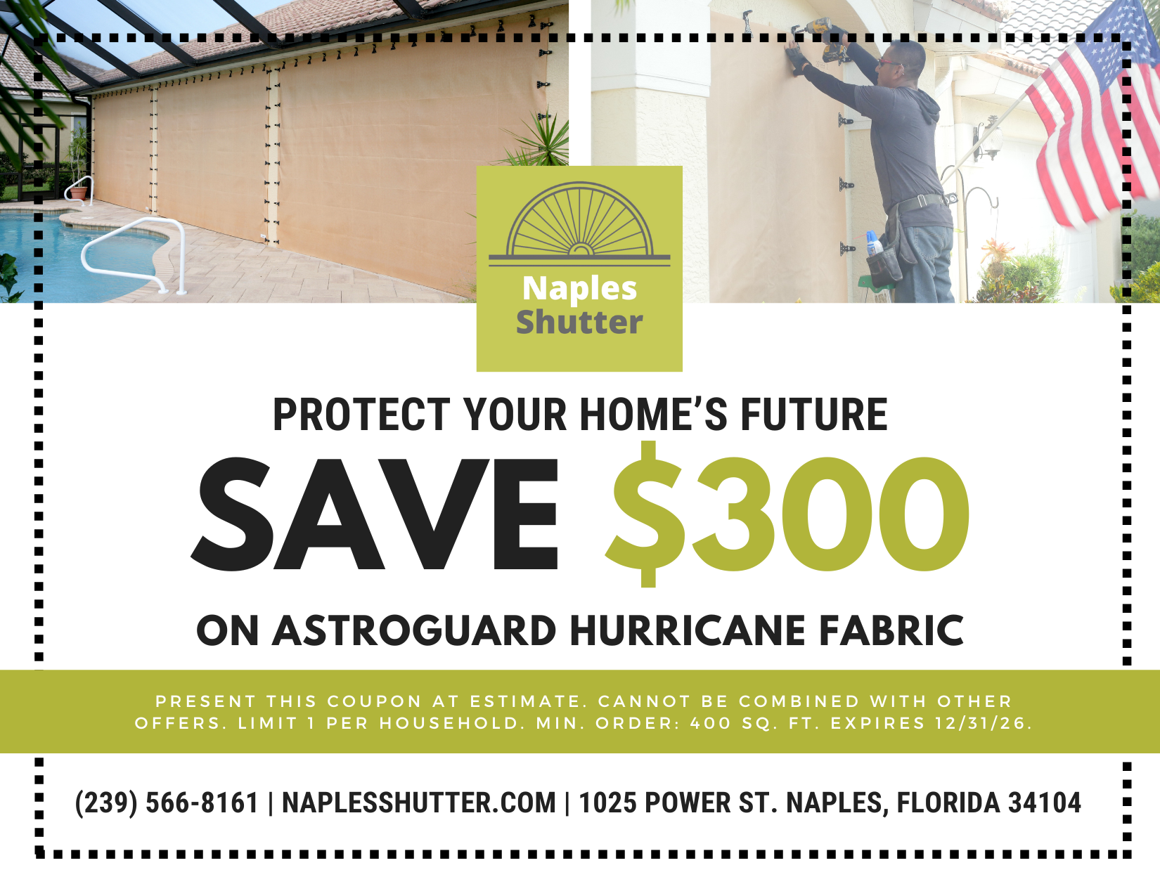 Save $300 on 400 square feet or more of AstroGuard Hurricane Fabric installed by Naples Shutter. Present this ad at time of estimate. Cannot be combined with other offers.